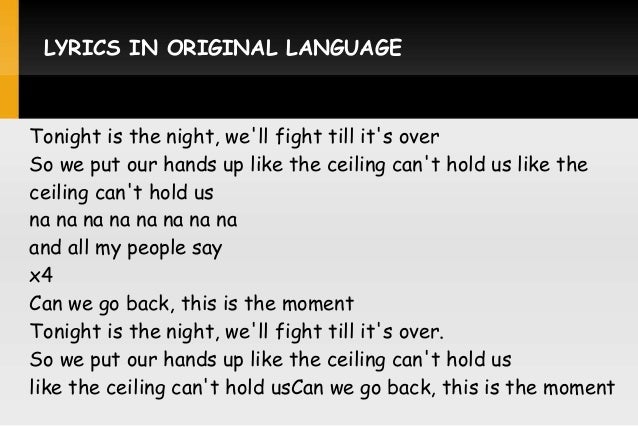This is the moment tonight is the night well fight till its over so we put our hands up like the ceiling cant hold us like the ceiling cant hold us now can i kick it.